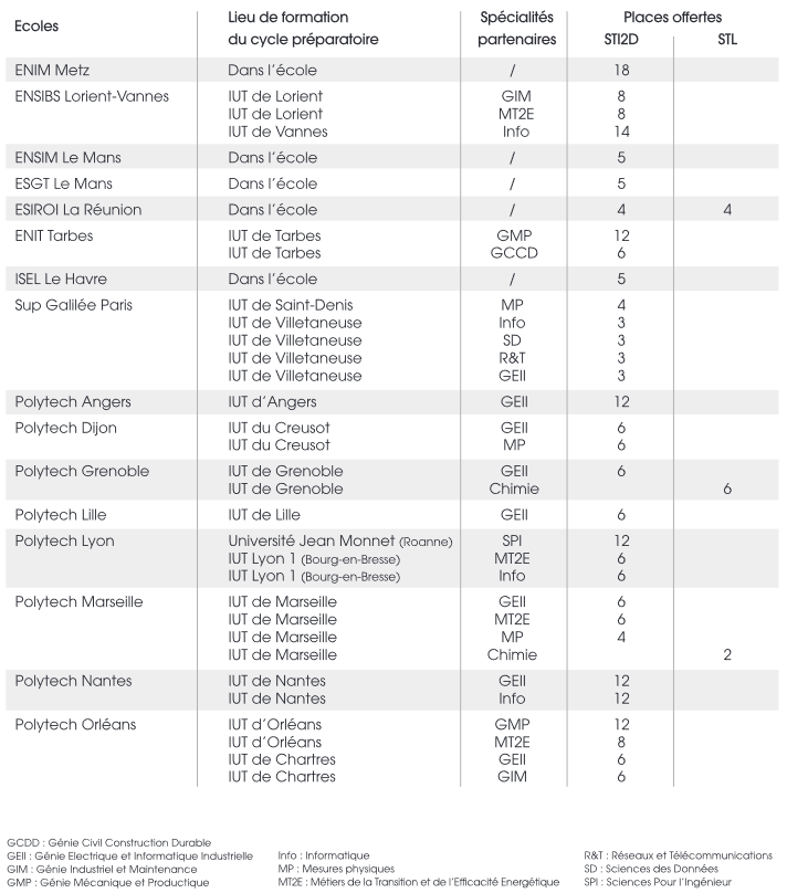 - Les écoles ENIT Tarbes et ENSIBS Lorient-Vannes et Sup Galilée Paris collaborent avec des IUT partenaires. Les cours se déroulent en IUT, avec un complément de formation dans l’école d’ingénieurs. Après validation du parcours préparatoire, les étudiants poursuivent leur formation d’ingénieur dans l’école.